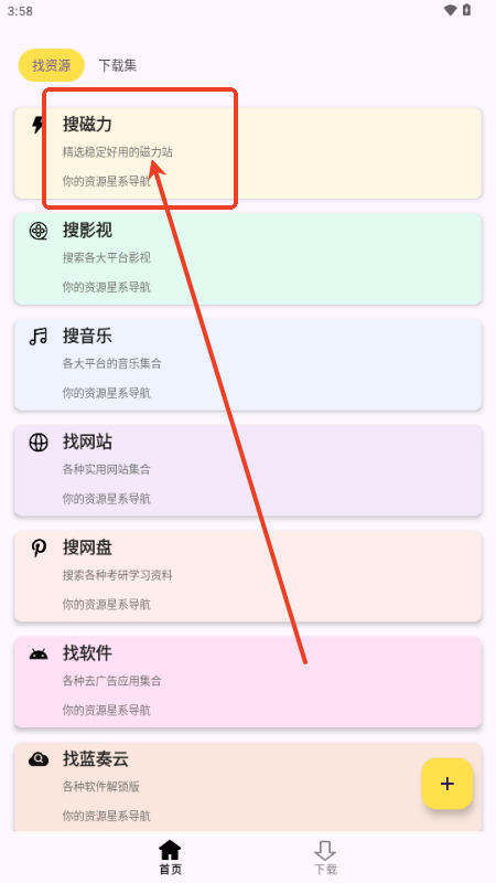 2、进入之后可以看到很多的功能,包含搜磁力、搜音乐以及搜网盘等。