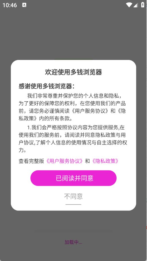 1、用户首先需在3G游戏网的多钱浏览器中,查看并同意隐私政策与用户协议。
