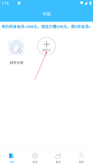 1、在书架页面点击【自定义】,进入创作中心。