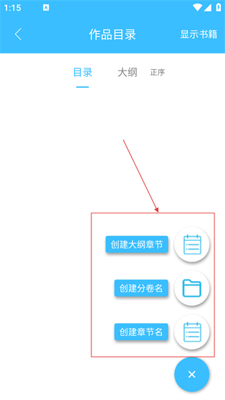 4、在展开的菜单里,你可以选择创建大纲章节、分卷名或者章节名,以此来进行作品编辑。