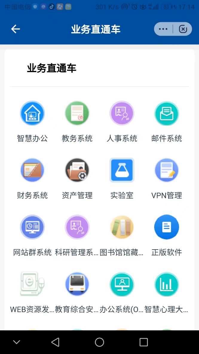 9、在“业务直通车”中可以方便的访问各类信息系统。除教务系统、图书馆馆藏检索、支付平台等外网放开的系统,其他系统目前暂时无法从校园网外使用。部分系统因为原系统不支持移动设备适配,可能无法良好使用。我们会不断改进。