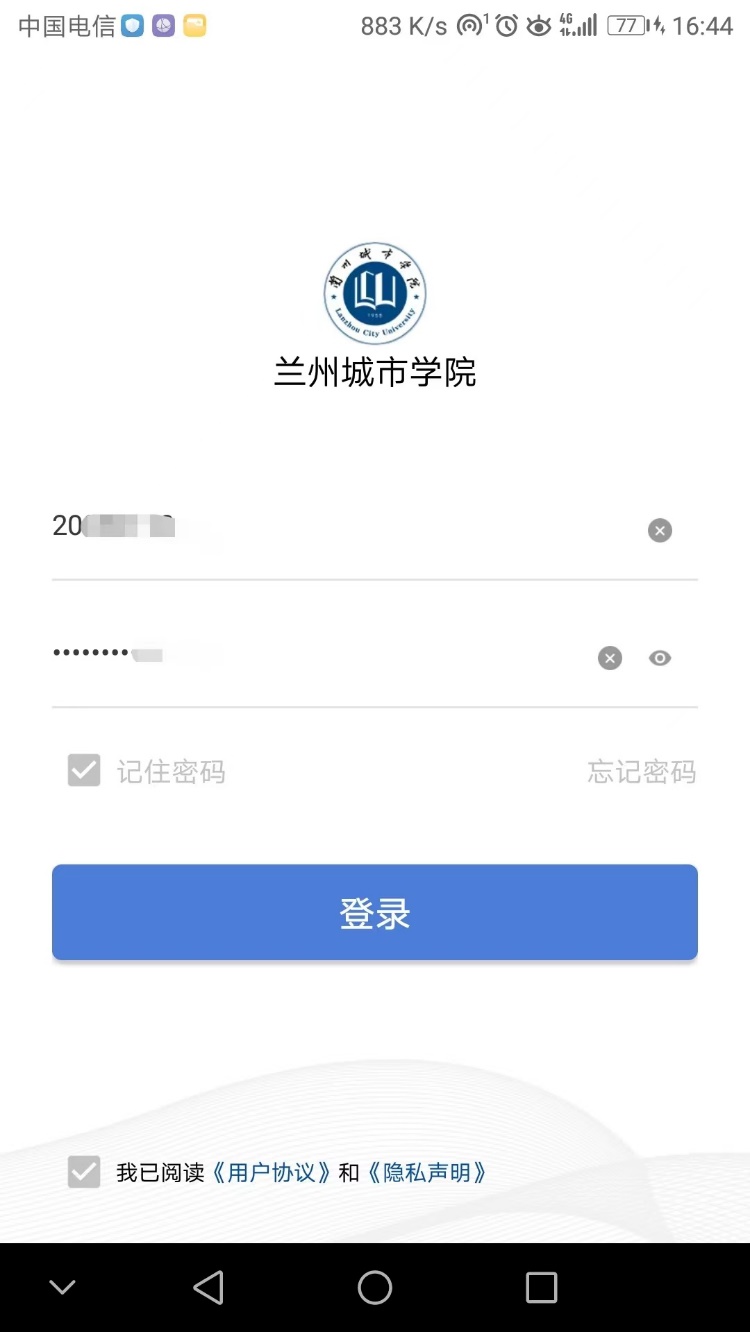 2、打开后在界面中输入工号(学号)及密码,勾选“记住密码”以及“我已阅读”的选项。点击登录。