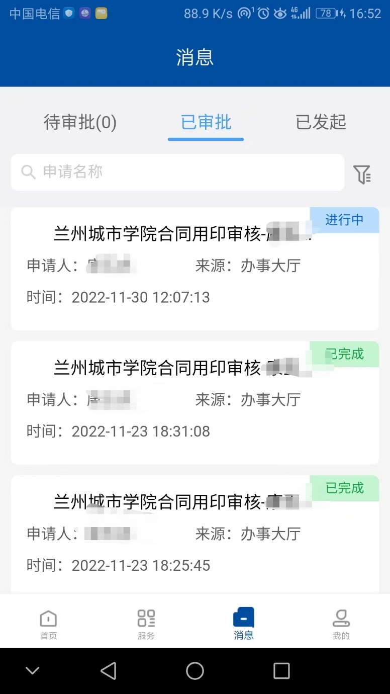 6、点击页面下方导航栏“消息”按钮,转到“消息”页面,即可处理“待审批”、“已审批”、“已发起”等类型的工作流程。其中,“待审批”是他人发起,需要自己审批的流程。“已审批”是自己审批过的流程。“已发起”是自己发起的流程。