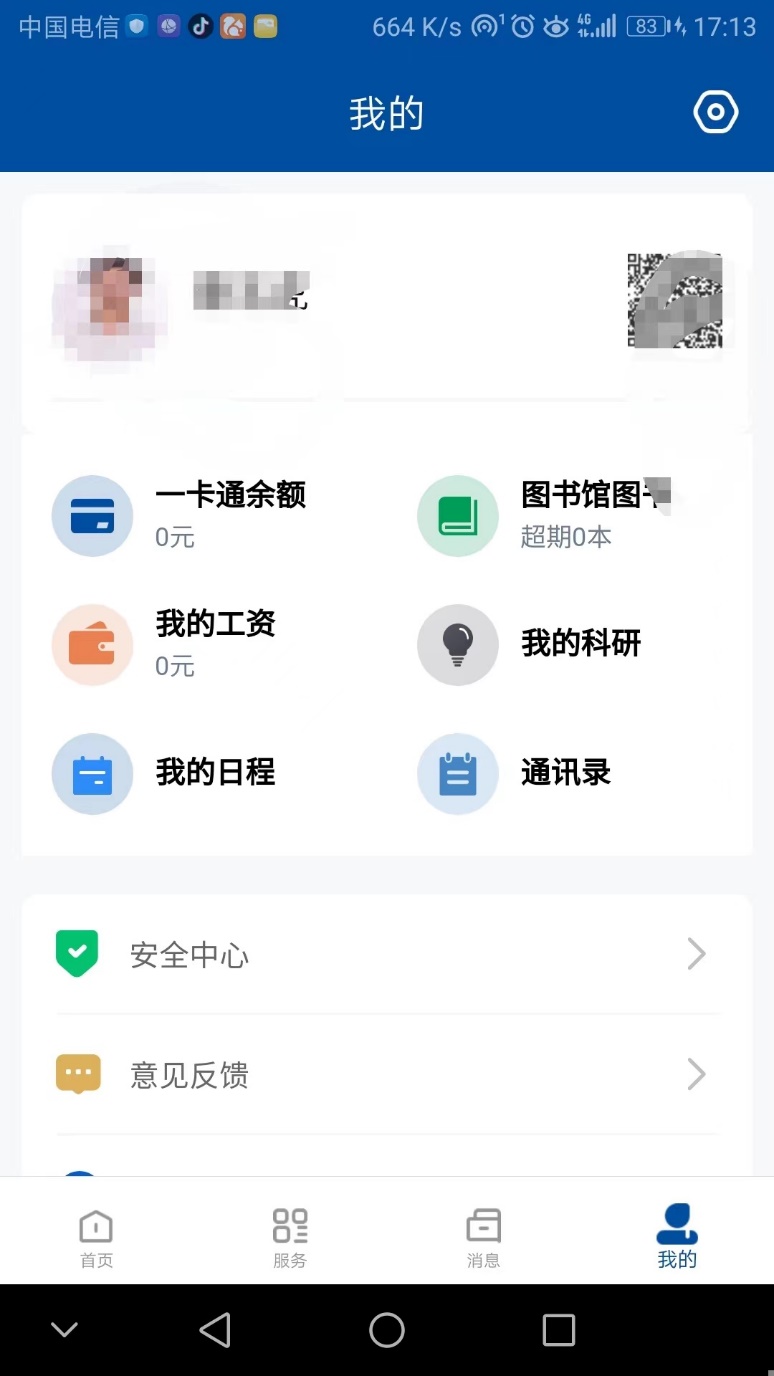 7、点击页面下方导航栏“我的”按钮,转到“我的”页面,提供常用卡片信息。如”一卡通余额”,“通讯录”、“我的工资”等。