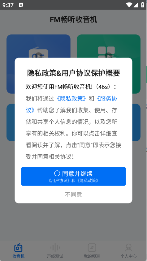 1、用户好FM畅听收音机之后,查看并同意隐私政策与用户协议。