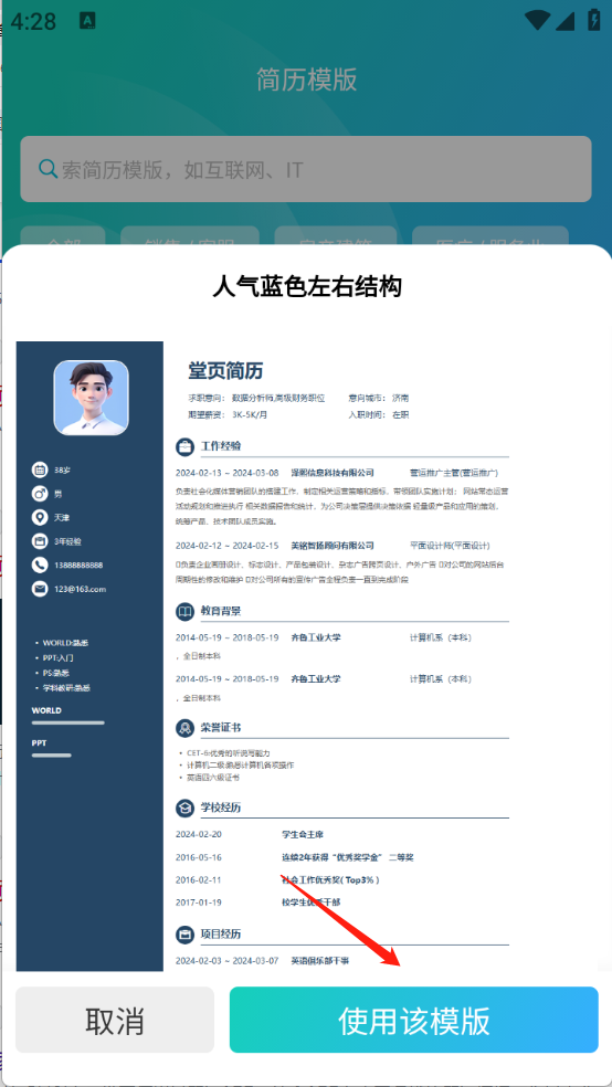 4、找到需要的模版之后,点击“使用该模版”即可。