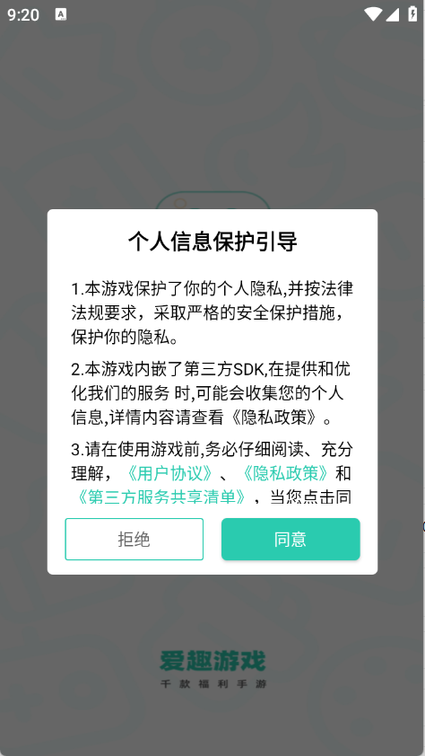 1、用户首先在3G游戏网爱趣游戏,查看并同意隐私政策与用户协议。