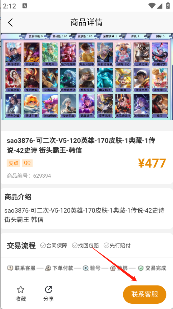 4当玩家选择了感兴趣的游戏资源后,可通过联系客服了解账号购买的相关流程,同时还能对该资源进行收藏或分享操作。