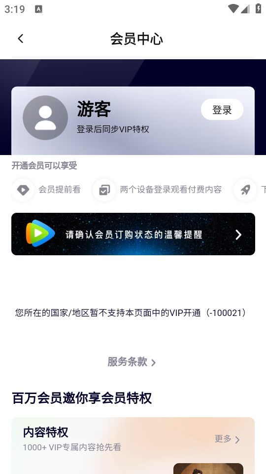 2、登录账号后可以看到“您所在的国家/地区不支持VIP服务”。