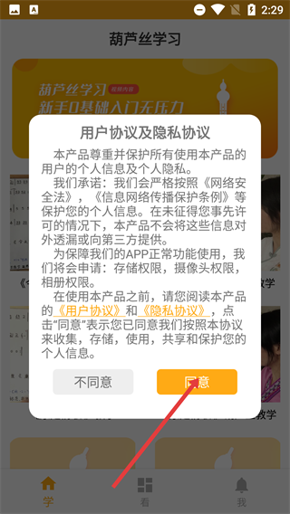 1、在葫芦丝学习应用弹出的用户协议与隐私协议窗口中,仔细阅读相关条款后,点击【同意】按钮,即可继续后续的应用使用流程。
