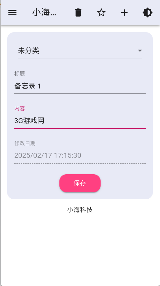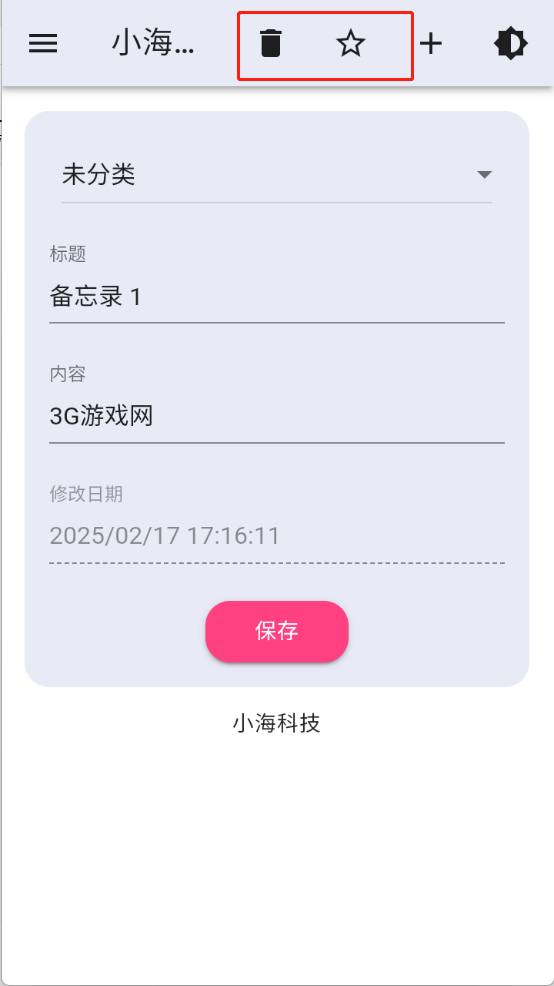 小海备忘录,免费的手机备忘录工具,可以填写待办事项、生活趣事以及旅游攻略等都是可以的,简洁的页面,自动记录填写时间,可以对备忘录进行收藏、删除等,轻松管理自己的记事本页面,让您的工作、生活井井有序。