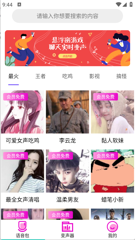 2、进入首页之后汇集了众多语音包,包含了最火、王者以及吃鸡、搞怪等类型。