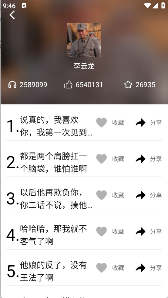 4、点开喜欢的语音包,可以播放、收藏以及分享等。