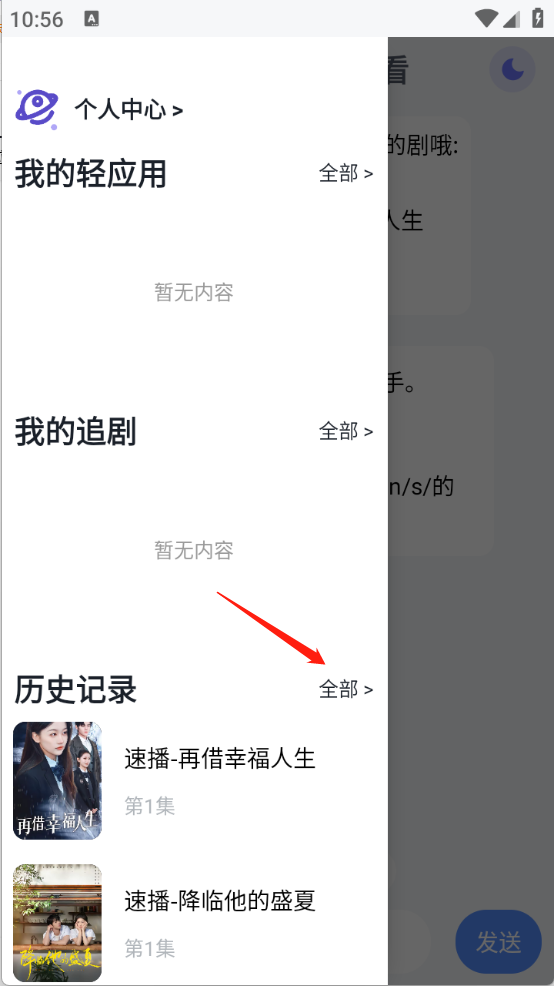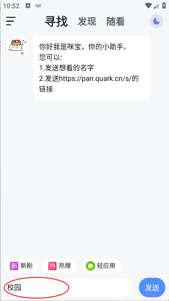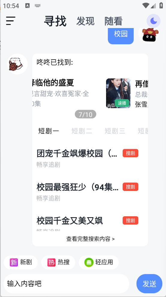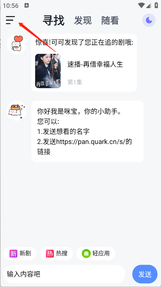 2、进入首页之后,在输入框中输入想看的短剧名称或者题材类型点击“发送”。