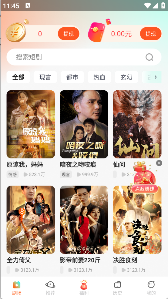 2、进入首页之后,有很多的短剧资源,包括现言、都是以及玄幻等。