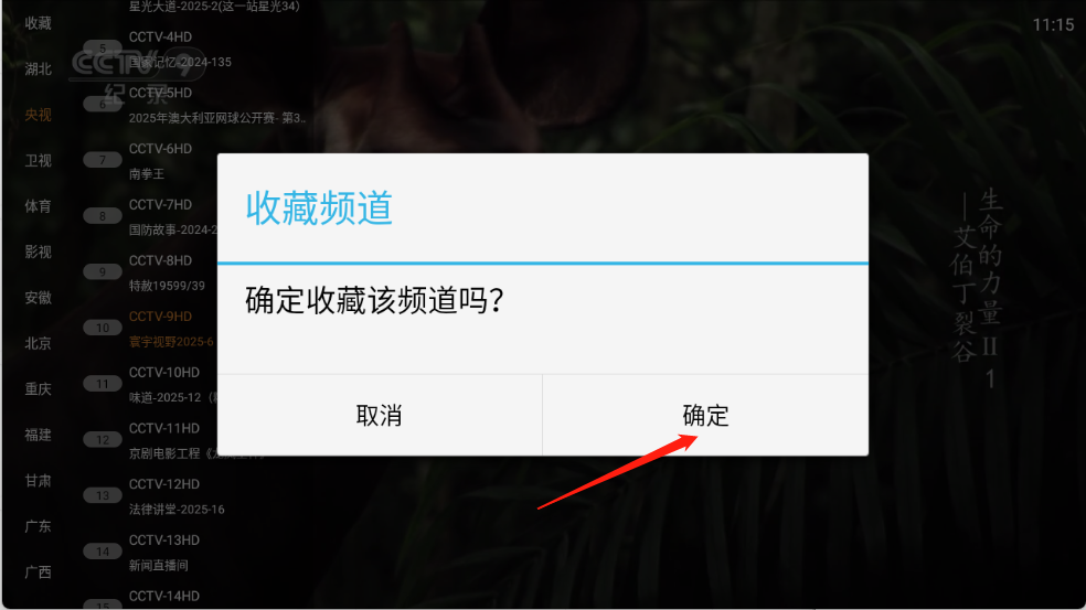 1、长按想要收藏的频道,在出现的弹框中点击“确定”。