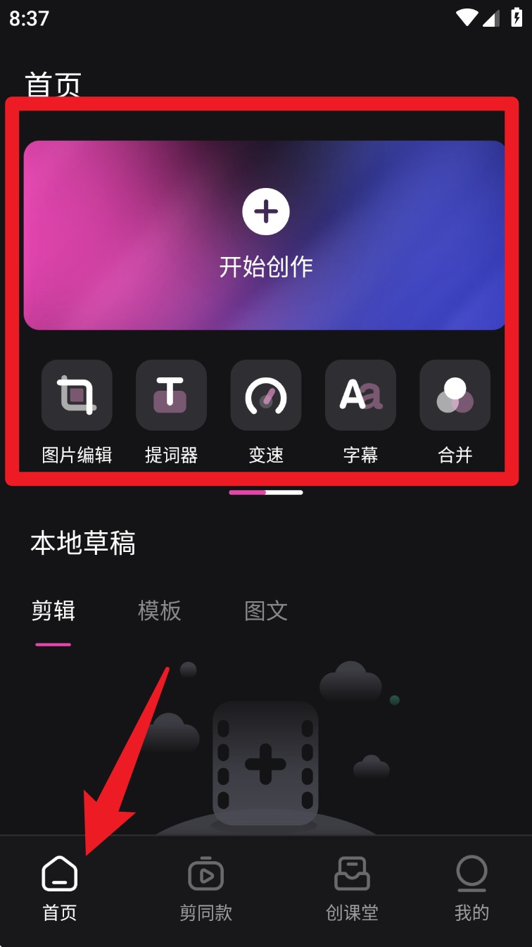 1打开应用的主界面后,点击顶部的“创作启动”选项,就能创建新的项目。另外,也能通过选择界面下方的功能模块,比如图片处理、台词辅助、速度调节或字幕添加等,直接进入对应的编辑环节。