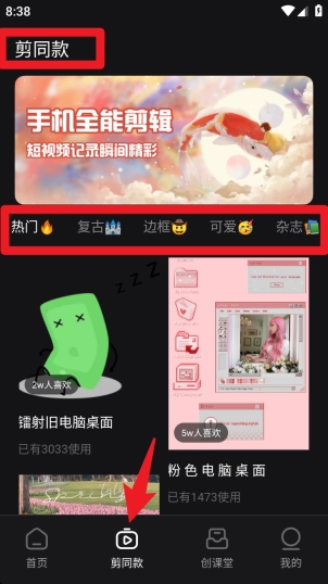 4要是想使用当下流行的模板,你可以点击页面下方的“剪同款”按钮,接着在各类风格分类里挑选你钟爱的模板类型,像复古风、带边框的、可爱风等都有,之后一键应用就能快速生成符合要求的短片样式了。