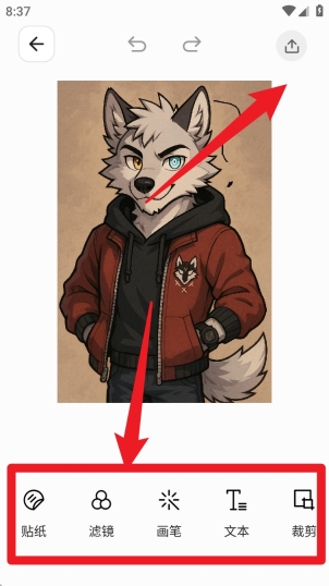 3导入素材后,你可以在底部工具栏里挑选贴纸、滤镜、画笔、文本或者裁剪这类功能来处理图像,等调整好了,点击右上角的按钮就能把作品导出或者分享出去。