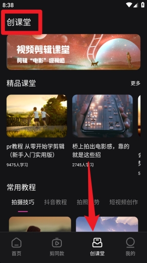 5. 若想学习剪辑相关技巧,可切换至底部的“创课堂”模块,从中挑选对应的课程内容,像拍摄教学、抖音教程等都有涵盖,不仅支持免费学习,还能反复观看进行练习。