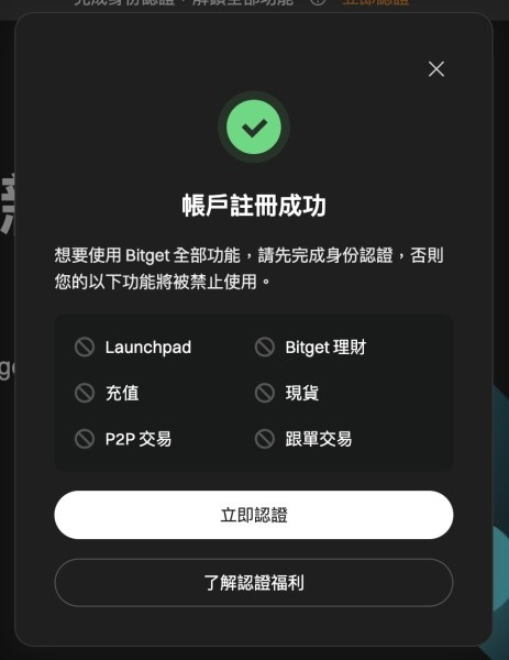 2完成基础注册步骤后,系统会提示需进一步完成认证流程,才能解锁平台大部分交易相关功能,所以这一步是必须继续推进的。