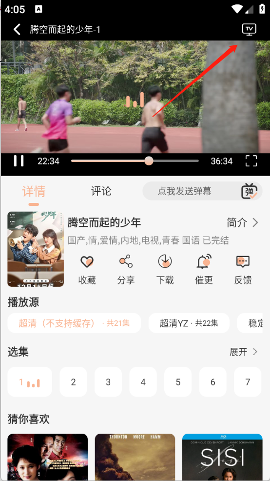 1、随意打开一部影视,进入详情页点击右上角的“TV”。