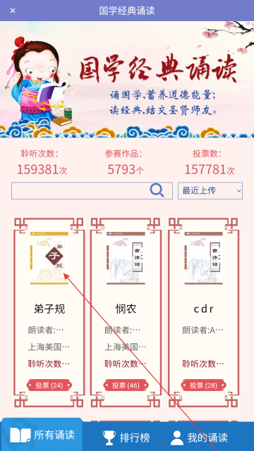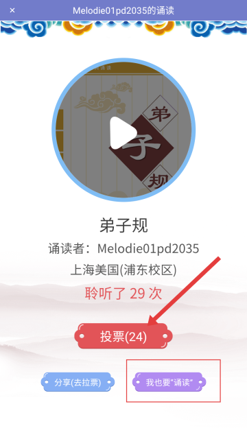 3、进入诵读详情页面后,找到【投票】按钮并点击,即可为该诵读作品进行投票。