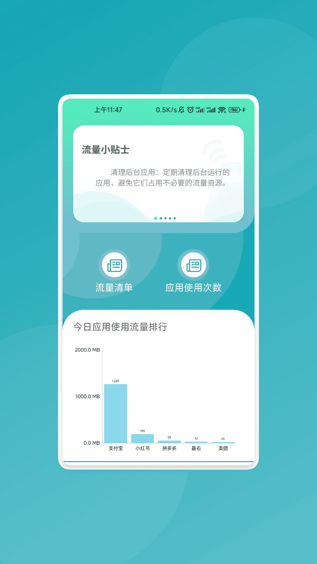 3、流量清单与应用使用次数功能,可清晰呈现各应用的流量使用状况,使用户对流量消耗一目了然。