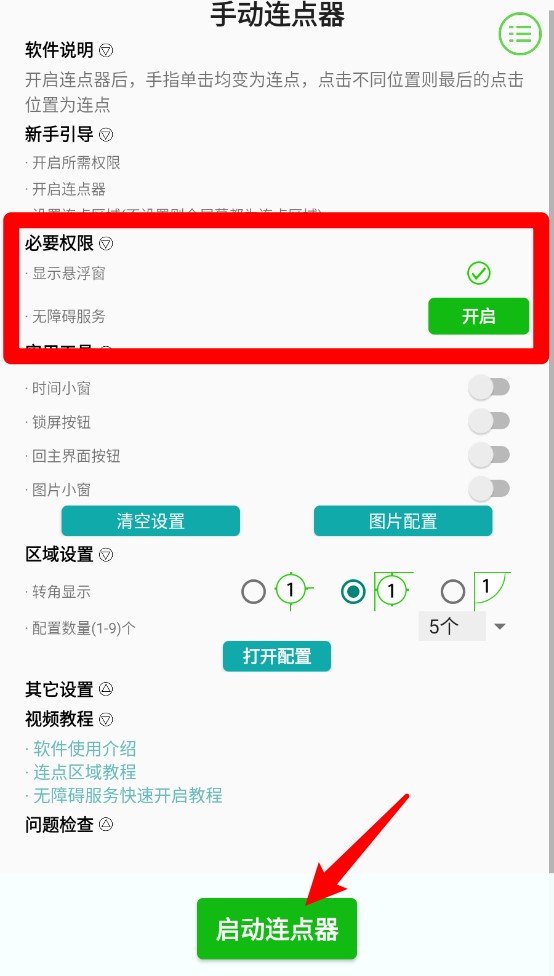 1、初次使用时需要授予“显示浮窗”与“无障碍服务”权限,开启后就能在屏幕上自主进行连点操作。