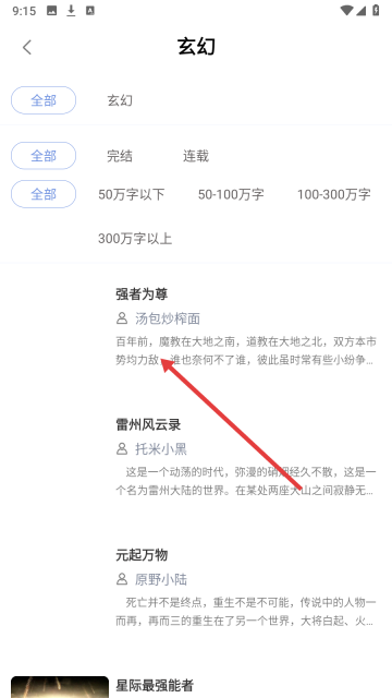 3、玄幻分类页点击【强者为尊】进入小说详情界面。