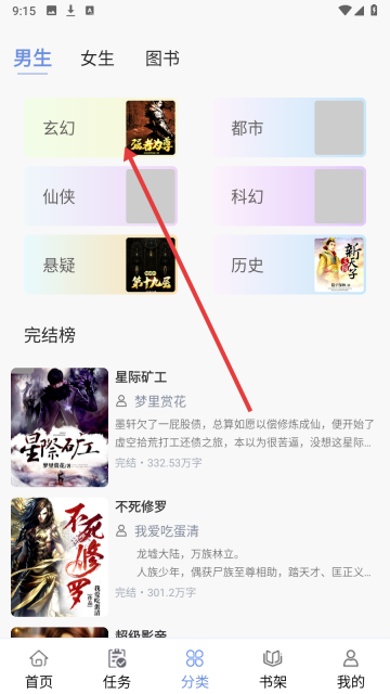 2、分类页选【玄幻】板块,进入对应小说分类页面。