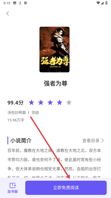4、在小说详情页找到【立即免费阅读】按钮并点击,就能开启阅读之旅了。
