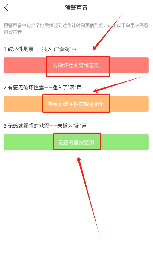 2、在科普页面的三个项目中,点击“预警声音”选项,就能试听不同级别的地震预警声音。