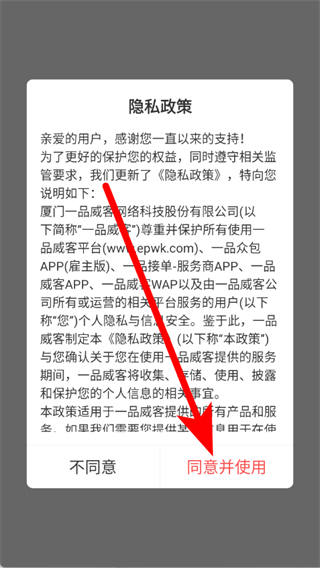 1启动一品众包应用后,当界面弹出隐私政策相关提示框时,选择“同意并使用”选项以继续操作。