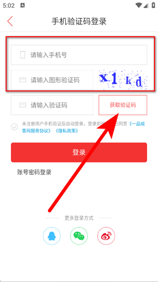 3、进入手机验证码登录界面,填写手机号与图形验证码后,点击“获取验证码”按钮。