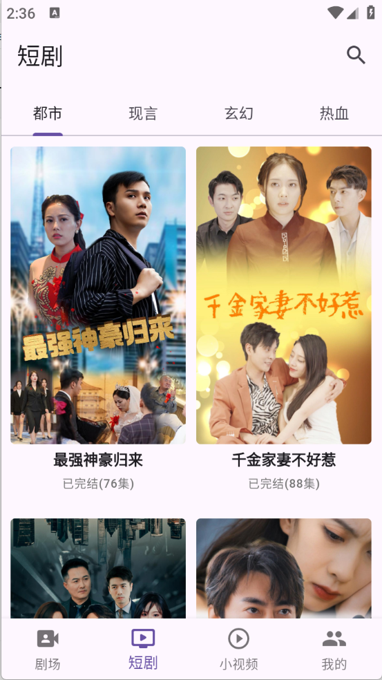 4、短剧栏目将短剧进行了详细的分类,包括都市、现言以及玄幻等类型。
