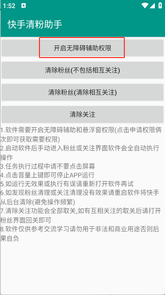 1、软件需要开启无障碍辅助和悬浮窗权限(点击申请权限俩次即可获取需要权限)