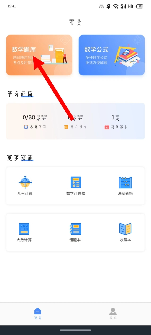 1、打开数学解题应用,在首页找到并点击数学题库模块,即可进入数学题库分类页面。