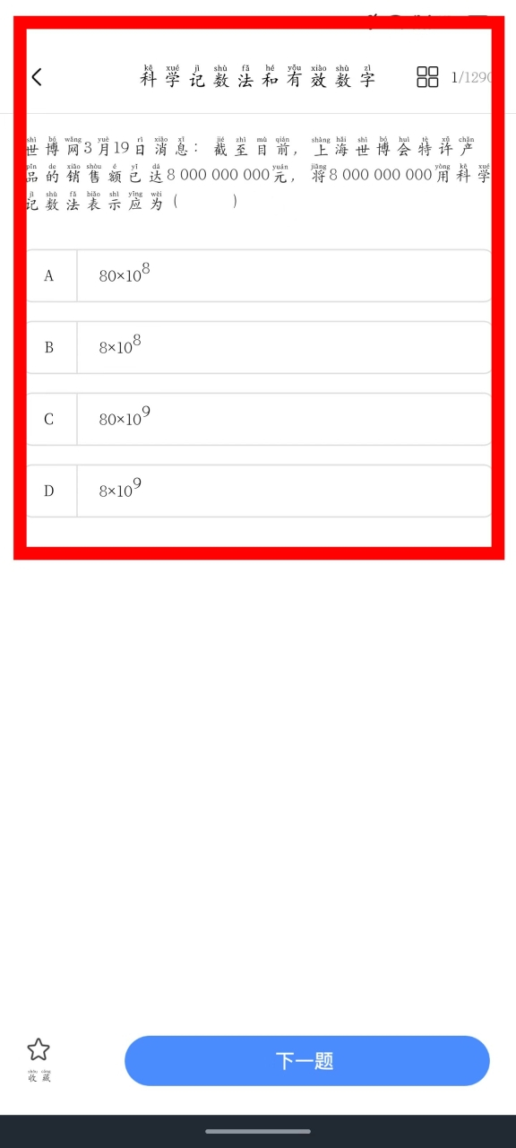 3、当看到具体题目时,完成当前这道题目后,点击页面底部的“下一题”按钮。