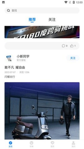 2、点击“发现”板块,可实时浏览新日电动车的最新动态、资讯与潮流信息,轻松把握行业前沿趋势。