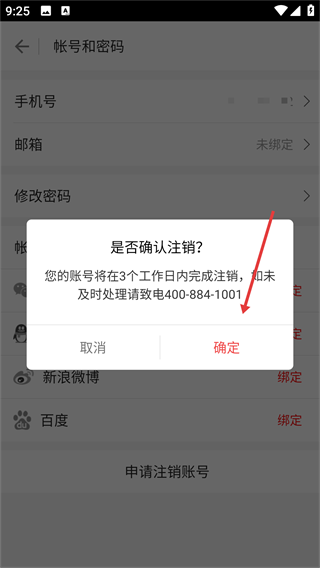 4当系统弹出“是否确认注销?”的提示框时,点击其中的【确定】按钮,即可提交账号注销的申请。