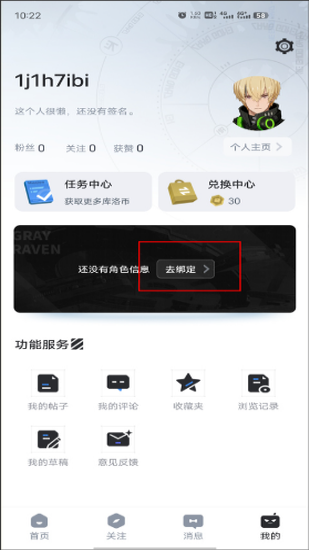 1、打开库街区App后,点击界面右下角的“我的”按钮,进入个人中心页面。在个人中心页面中,如果还没有绑定过游戏角色信息,会显示“还没有角色信息”的提示。点击该提示即可进行绑定操作。