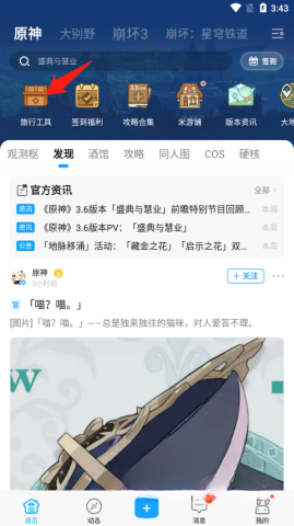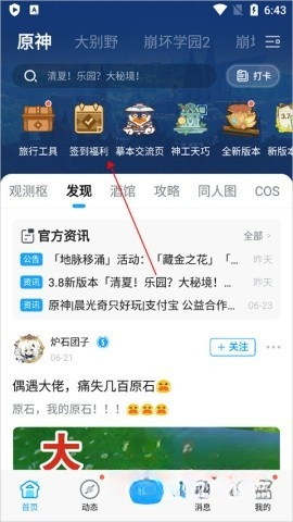 1. 打开米游社,进入后点击原神关注,进入应用页面。