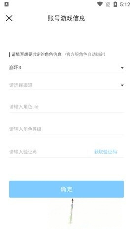 4、填写绑定角色相关信息,涵盖游戏、渠道、UID、等级以及验证码,完成后点击“确定”即可。