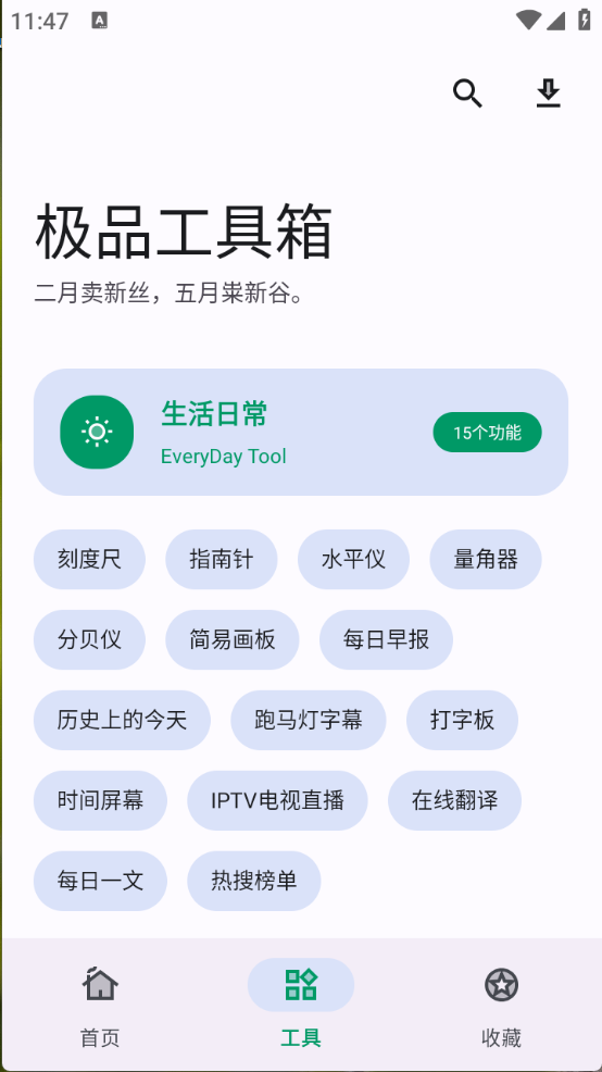 极品工具箱,一个全能的手机工具箱,汇集了众多优质的工具资源,不管是刻度尺、分贝仪还是量角器等都有,所有的工具资源都是免费使用的,可以将常用的工具进行收藏,每一款工具都还在不断优化,致力于为用户带来更多优质的工具。