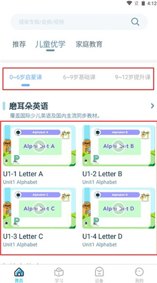 2找到“儿童优学”的入口并点击,就能在其中浏览到针对不同年龄段孩子设计的启蒙课程。