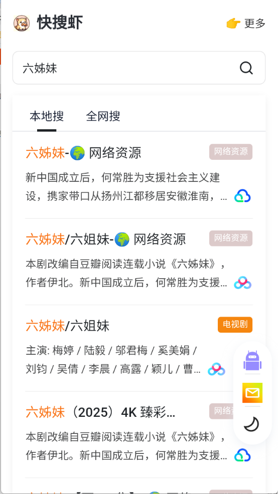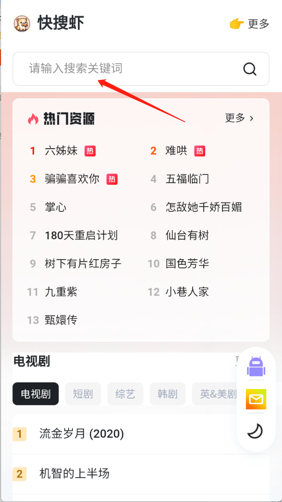 快搜虾,强大的资源搜索神器,它主要是搜索影视资源,电视剧、电影以及综艺等类型都有,搜索速度超级快,首页为大家提供了很多的影视排行榜,帮助用户及时发现自己喜欢的影视内容,还要很多学习资源、办公软件等。