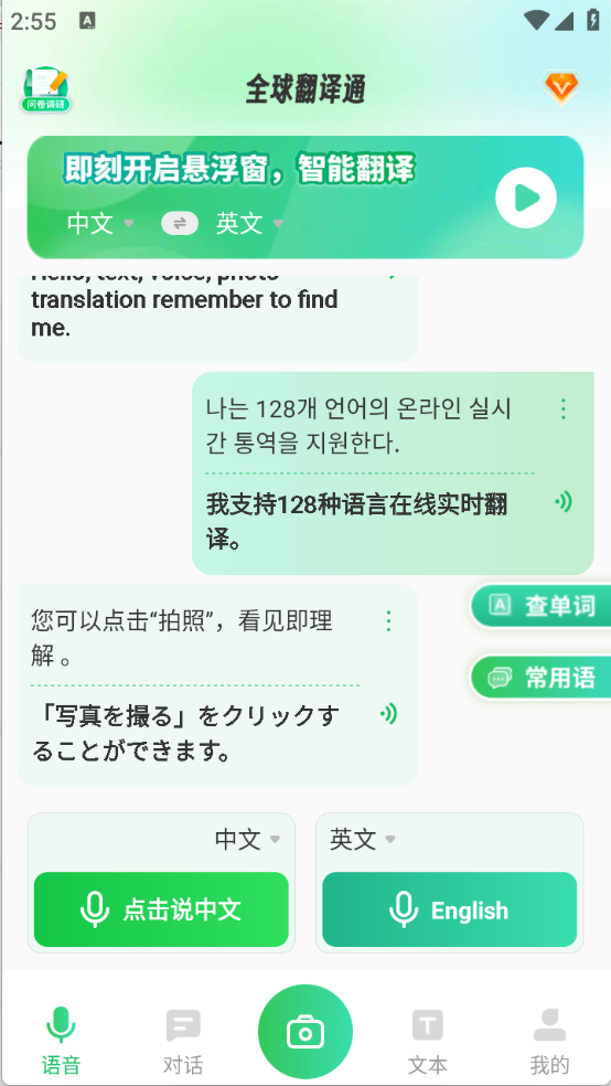1、语音对话翻译,中文、英文、日文、泰语等输入,适合中英文对话。
