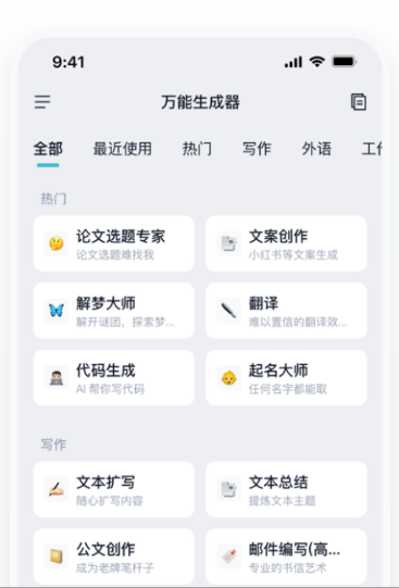 万能生成器堪称解决各类文字、语言及创意需求的得力助手,它并非单一的内容生成工具,而是整合了写作、翻译、职场、学术等多元功能,实现了一站式难题。不管是撰写文章、制作报告,还是进行外语翻译、语法校验,乃至寻求编程方面的协助,万能生成器都能迅速提供专业支持。其使用方式十分灵活,你可依据实际需求挑选不同功能模块,让创作过程更轻松顺畅。此外,万能生成器还能激发生活灵感,助力产出有趣且实用的文案,既节省时间又减轻负担。
