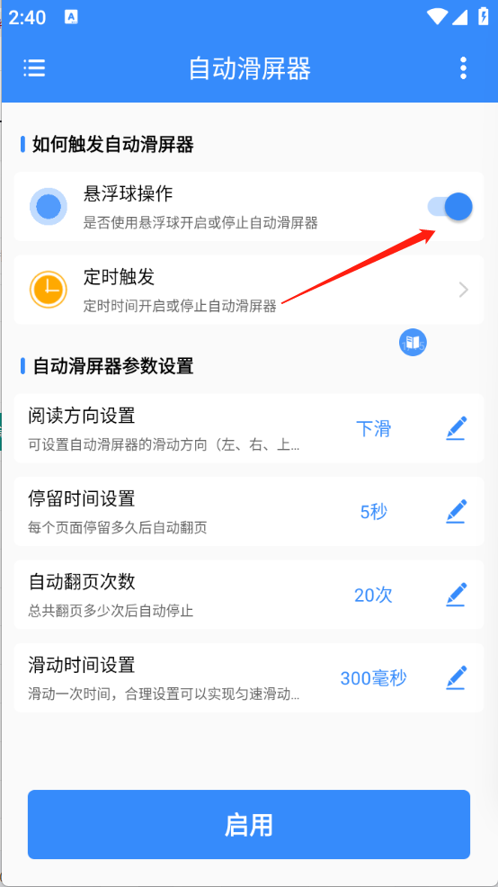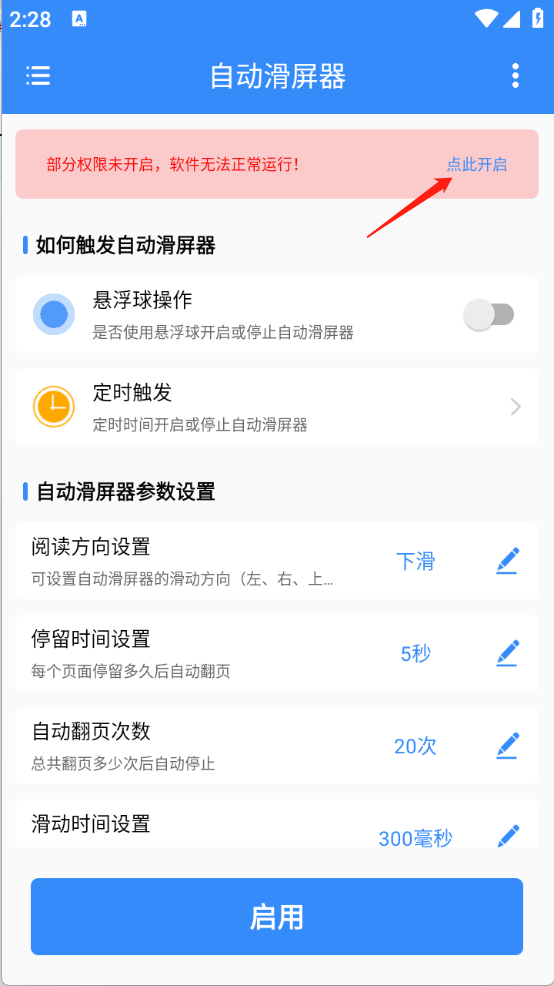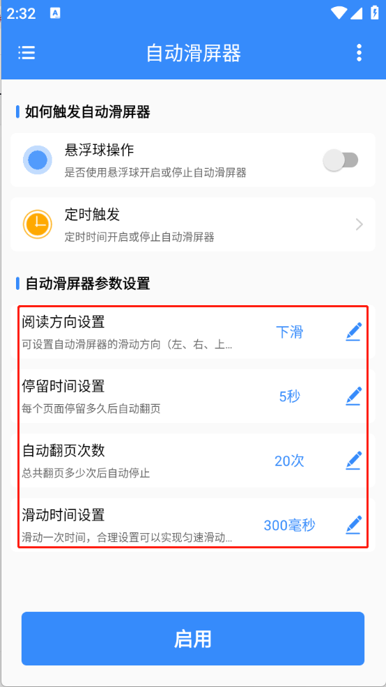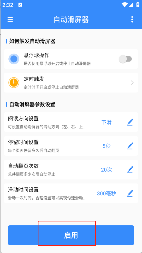 3、开启权限之后回到首页页面,设置定时触发,主要是凯奇或者停止自动滑屏器的时间,也可以开启悬浮球权限。